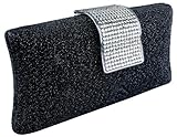 Glamorous Glitter Black Hard Case Evening Clutch Baguette Handbag Purse Rhinestone Closure w/Detachable Chain Feature